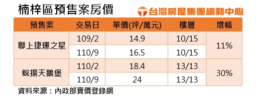 除了成屋市場表現亮眼,高雄預售市場價格也跟著「聞積起舞」,台灣房屋集團趨勢中心觀察楠梓區今年交易的預售案件,實價登錄資料顯示,指標案如「聯上捷運之星」,今年初的10樓交易單價約為14.9萬元,而9月份最新單價達16.5萬元,一年不到,價漲一成!