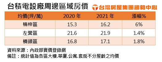 【理財周刊記者顏瓊真報導】台積電落腳楠梓中油高雄煉油廠舊址,終於拍板定案,而根據台灣房屋集團統計,楠梓區房價從去年每坪均價15.3萬元,至今年每坪均價來到16.2萬元,漲幅達6%!除了楠梓區,屬於第一圈受惠區的左營區與橋頭區,房價同樣漲聲響起,均有1.4~1.8%漲幅。
