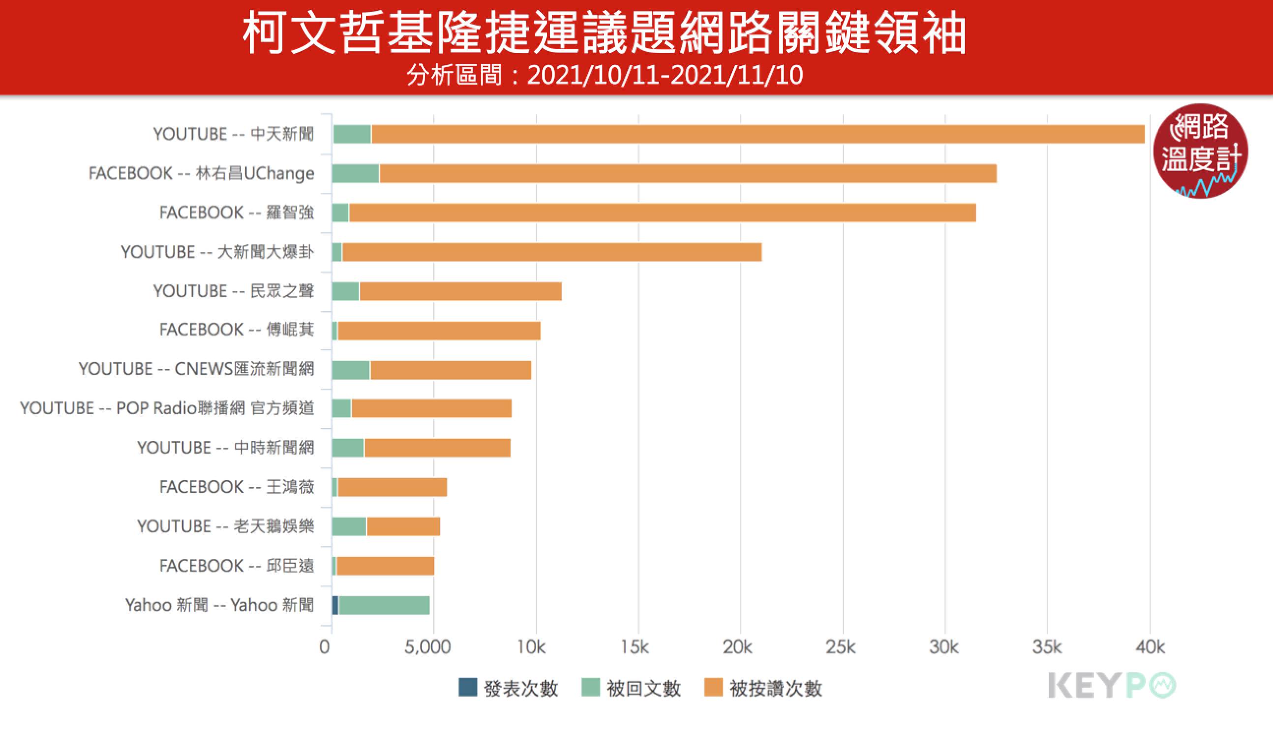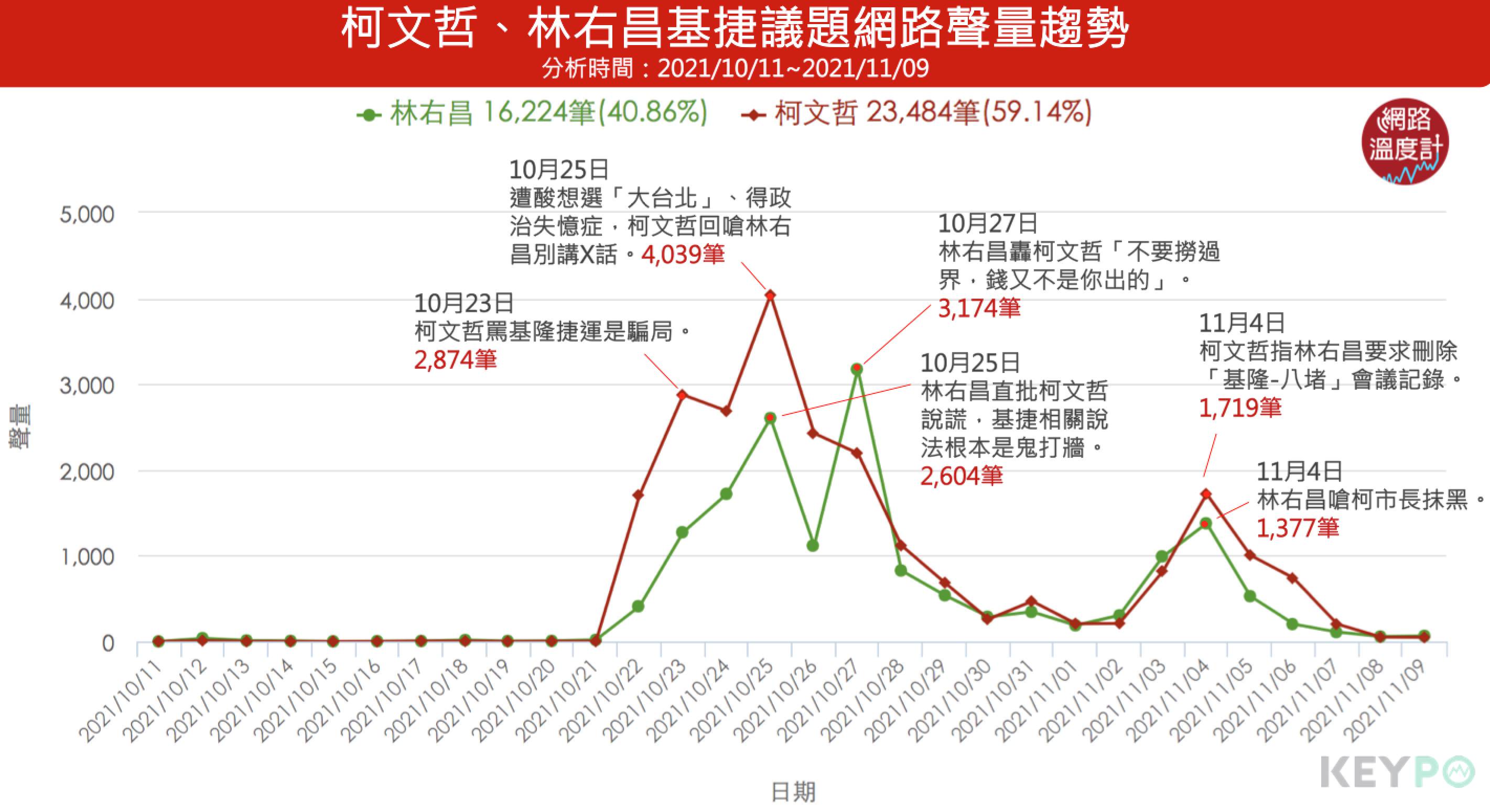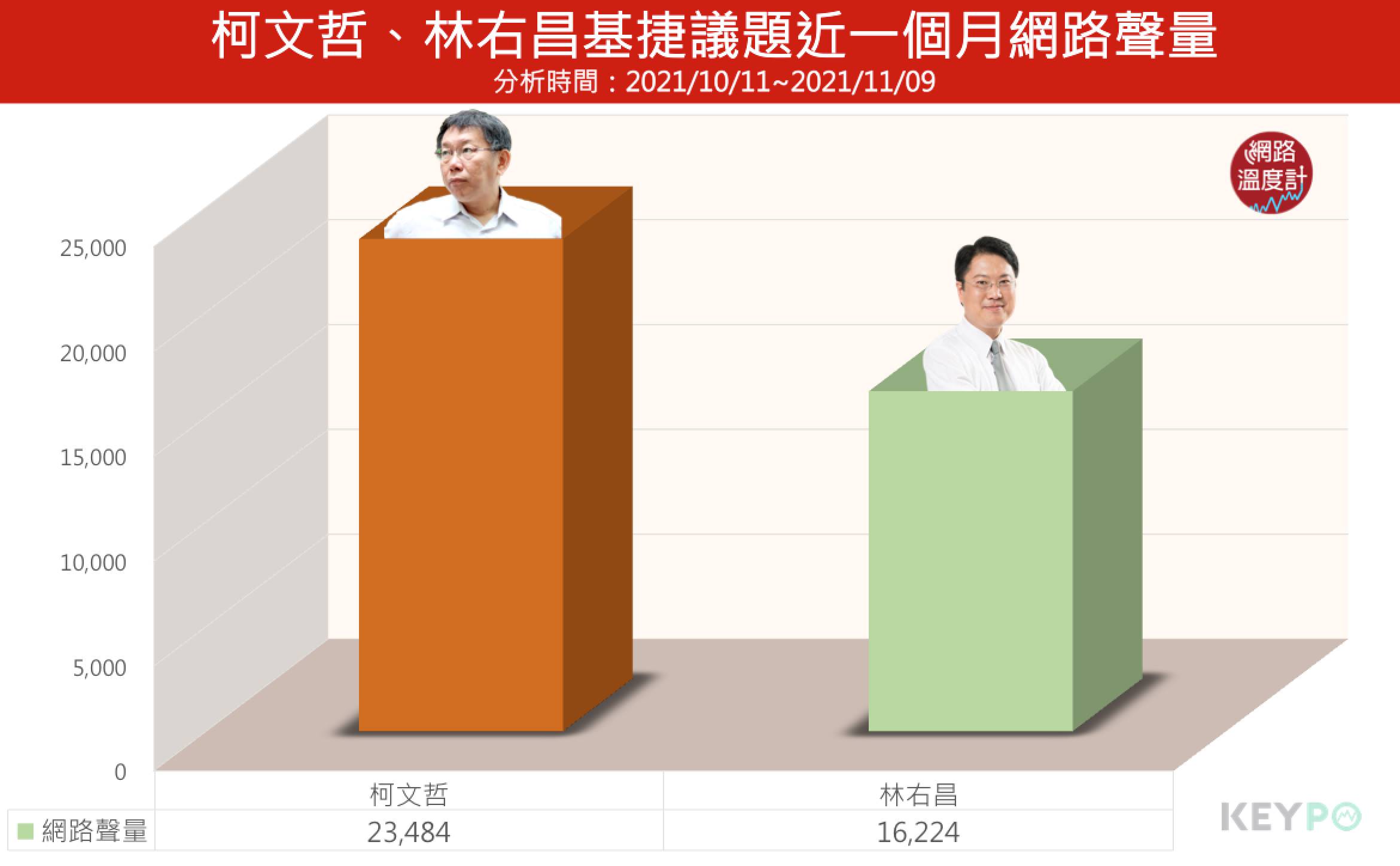 透過《KEYPO大數據關鍵引擎》(2021/10/11~2021/11/09)統計調查,柯文哲在近一個月基捷話題的討論聲量共有2萬3484筆,高於林右昌1萬6224筆。進一步從趨勢圖可以觀察到柯、林的聲量走勢起伏相當類似,幾乎可以說是「互罵、互嗆、互拉抬」,其中柯文哲的聲量高峰在10月25日,嗆林右昌不要講X話;而林右昌10月27日更是火力全開臉書發文砲轟「柯文哲市長不要撈過界,錢又不是你出的」,該天的回嗆也助攻林右昌聲量飆上高峰,但從網路聲量總數、幾次聲量高點來看,台北市長柯文哲還是領先林右昌。