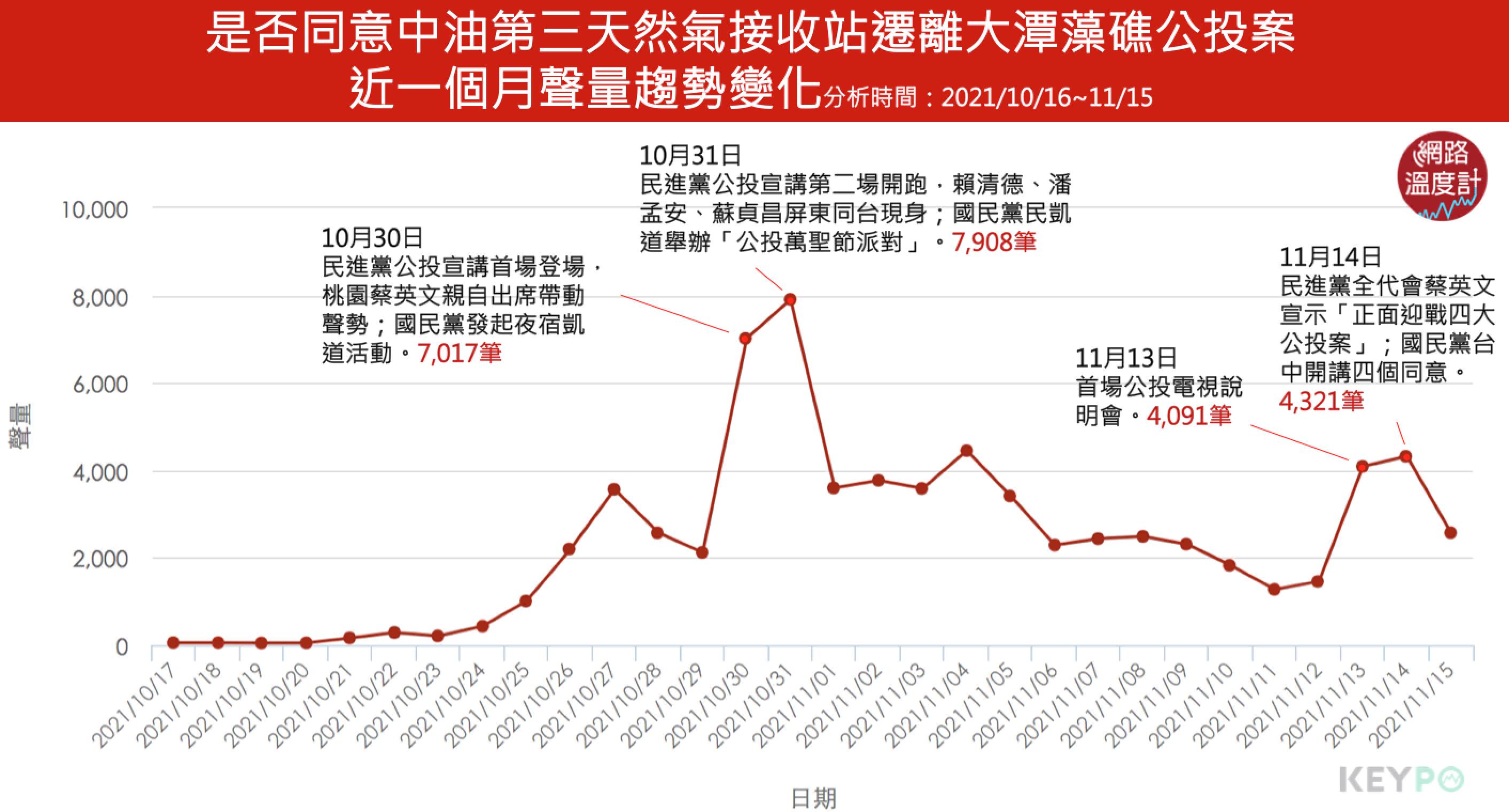 由民間團體領銜出的「是否同意中油第三天然氣接收站遷離桃園大潭藻礁海岸及海域公投案」,到底要如何兼顧環境與能源,向來是個複雜且難解的議題,首場公投電視說明會13日登場之後,正反雙方的相互拋出議題與質疑,快速拉抬「珍愛藻礁」的網路聲量,討論度也明顯增加,不過,電視說明會並非「珍愛藻礁」的近期聲量高點,其高峰是落在10月30日、31日週末兩天,主要在於民進黨豪擲5800萬元力拚擋下四大公投案,10月底率先在屏東、桃園發起公投宣講活動,同一時間,國民黨台北市議員羅智強也發起「夜宿凱道」,包括議員、民代、名嘴們持續接力,炒熱話題與討論,並搭配街頭開講衝高聲勢,藍綠雙方隔空交鋒,不僅讓公投議題發酵,珍愛藻礁一案也連帶增加曝光度。