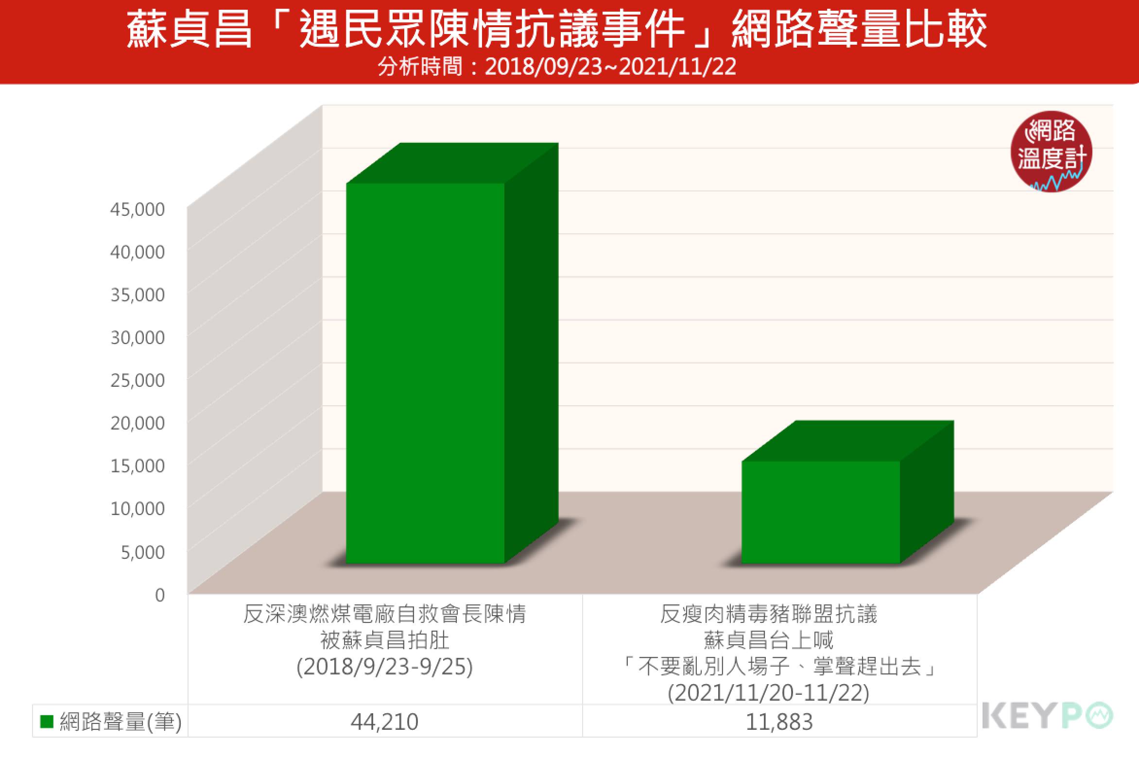 根據<KEYPO大數據關鍵引擎>(2021/11/20~2021/11/22)統計調查,遭反萊豬民眾抗議,蘇貞昌台上說「不要來亂別人場子」、「用掌聲趕他出去」共有1萬1883筆討論,不過還是輸給2018年的反深澳燃煤電廠自救會長會長陳志強上前陳情時,被蘇貞昌「拍肩、拍肚」事件,被指稱為「敷衍、打發」,創下4萬4210筆網路聲量(2018/09/23~2018/09/25),討論度相當高。