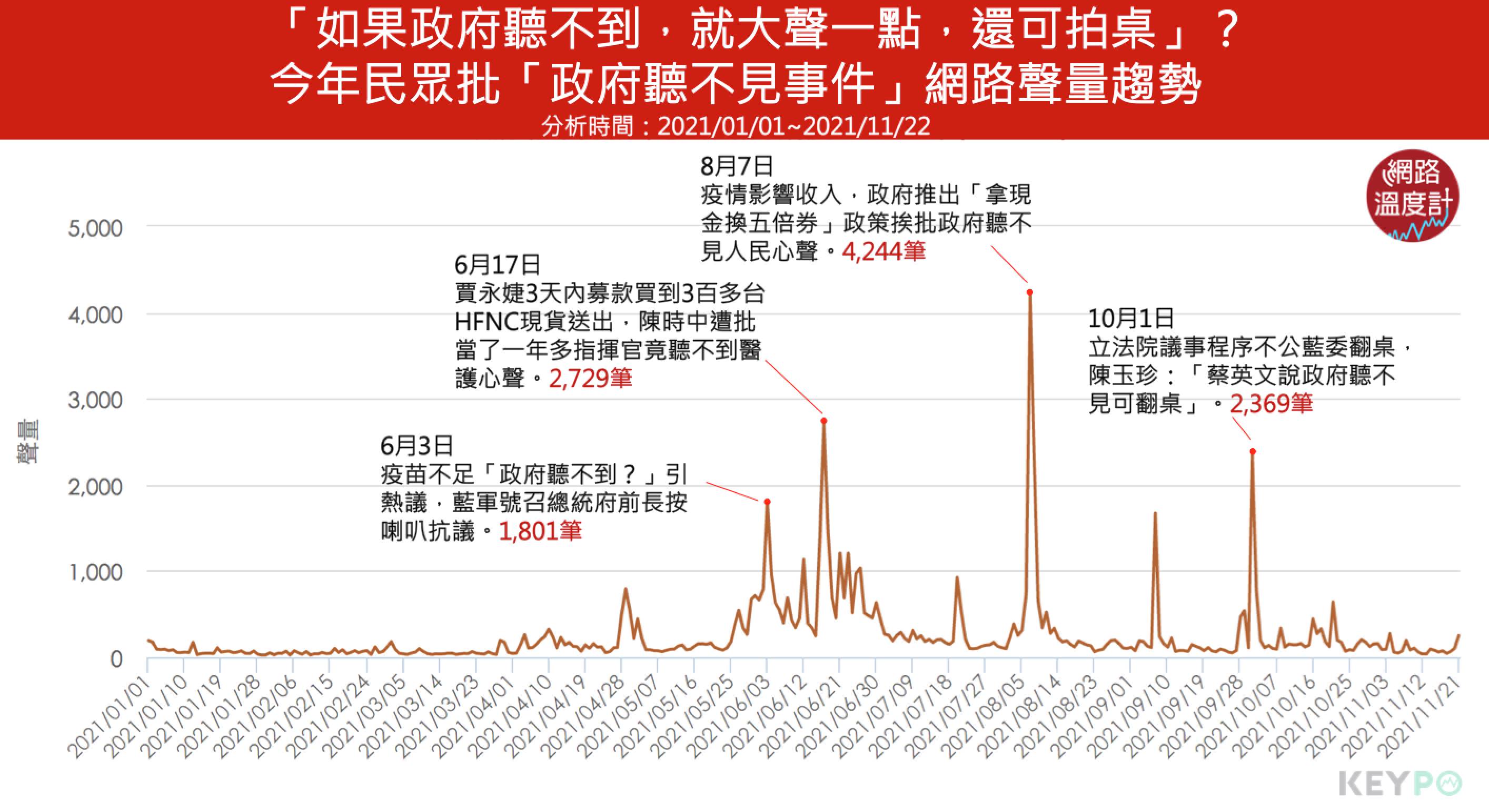 這幾年面對民眾的陳情、嗆聲、抗議,政府的回應與態度有時難以令民眾滿意,因此不少網友紛紛討論起,過去蔡英文希望年輕人別怕跟政府機關溝通,還強調民進黨與蔡政府具有雅量,「如果政府第一次聽不見,大聲一點;如果第二次再聽不見,你可以更大聲一點;第三次再聽不見的時候,你可以拍桌子」。就是因為這番話,每當政府政策與民意出現落差時,就會被拿出來檢視,透過《KEYPO大數據關鍵引擎》(2021/01/01~2021/11/22)盤點今年被指出「政府聽不見事件」的網路聲量,可以發現討論度最高的是「拿現金換五倍券」事件,主要在於過去這段時間,很多民眾收入不穩,要拿出現金才能領五倍券,相當不便民,因此遭到批評。第二高為賈永婕短短三天內募款買到3百多台HFNC,到處奔走分送給全台各地醫療院所,陳時中被轟當了一年多指揮官卻聽不到醫護心聲等等,前幾名幾乎都與疫情、疫苗、五倍券有關聯。如果政府聽不到,民眾能否大聲?能否拍桌?隨著諸多事件一一發生,民眾心中都有一把尺,當年蔡英文的金句,如今也成為檢視自己施政、政策的標準。