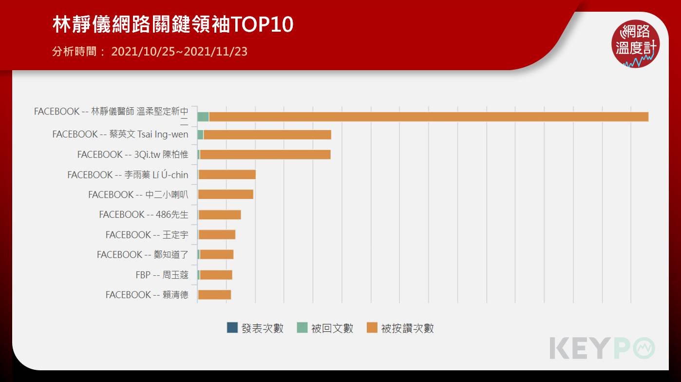進一步透過網路關鍵領袖來看,雙方臉書都是自己的最大發聲平台,對於後續各種議題主動出擊或回應皆有一定實力。周玉蔻近日積極砲打顏寬恒,力道遠大於聲援林靜儀,一舉成為顏寬恒自己以外的最大意見領袖,此外,焦糖哥哥陳嘉行、陳柏惟等人也上榜,目前顏寬恒呈現被綠營輪流圍攻的困境,不過他也因此獲得不少替自己發聲的機會,成為網路聲量持續領先的關鍵原因。反觀林靜儀關鍵領袖多為自己人,版面又幾乎被周玉蔻、陳柏惟搶去,使得過去善於開戰場、勇於替自己辯護的優勢沒地方發揮,未來周玉蔻若持續砲打顏寬恒,雖然多少能對他造成影響,但恐怕也會使林靜儀持續被邊緣化,更使補選焦點從候選人身上失焦。