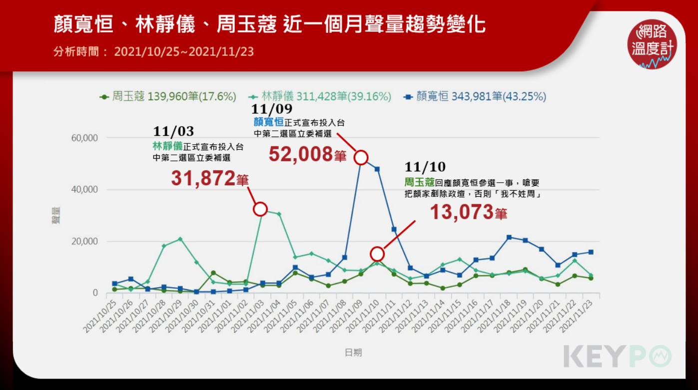 透過《KEYPO大數據關鍵引擎》調查(2021/10/25~2021/11/23),林靜儀敢說敢言、作風鮮明,贏得網路上一票死忠支持者,因此擁有出眾的「空戰」實力,率先宣布投入補選更替她帶來前期聲量上的優勢。不過顏寬恒宣布投入補選時,不只國民黨主席朱立倫,台中市長盧秀燕也現身相挺,衝出一波藍營大團結的氣勢,成功逆轉過去網路聲量的頹勢,連日聲量持續超車林靜儀,意外成為以「空戰」見長的林靜儀的一大隱憂。