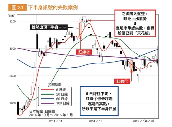 圖31 顯示日本製鐵(當時的公司名稱是新日鐵住金)的股價變動。右邊的紅線➀雖然突破了 5 日線,但是 5 日線完全呈現往下的方向,所以不是下半身訊號;而且股價也不符合「超過近期的高點」,無法組成組合技。這只是 5 日線跌破 60 日線和 100 日線之後的短暫反彈上漲罷了。