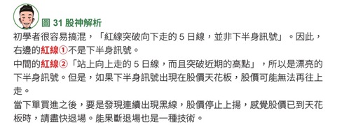 當 5 日線明顯往下走,即使突然出現站上 5 日線的紅線,也不算是下半身訊號。至少要在走平的狀態,最好是在 5 日線稍微往上走時,出現突破 5 日線的紅線,才算是完成下半身訊號。5 日線走平或往上走是下半身訊號成立的絕對條件。