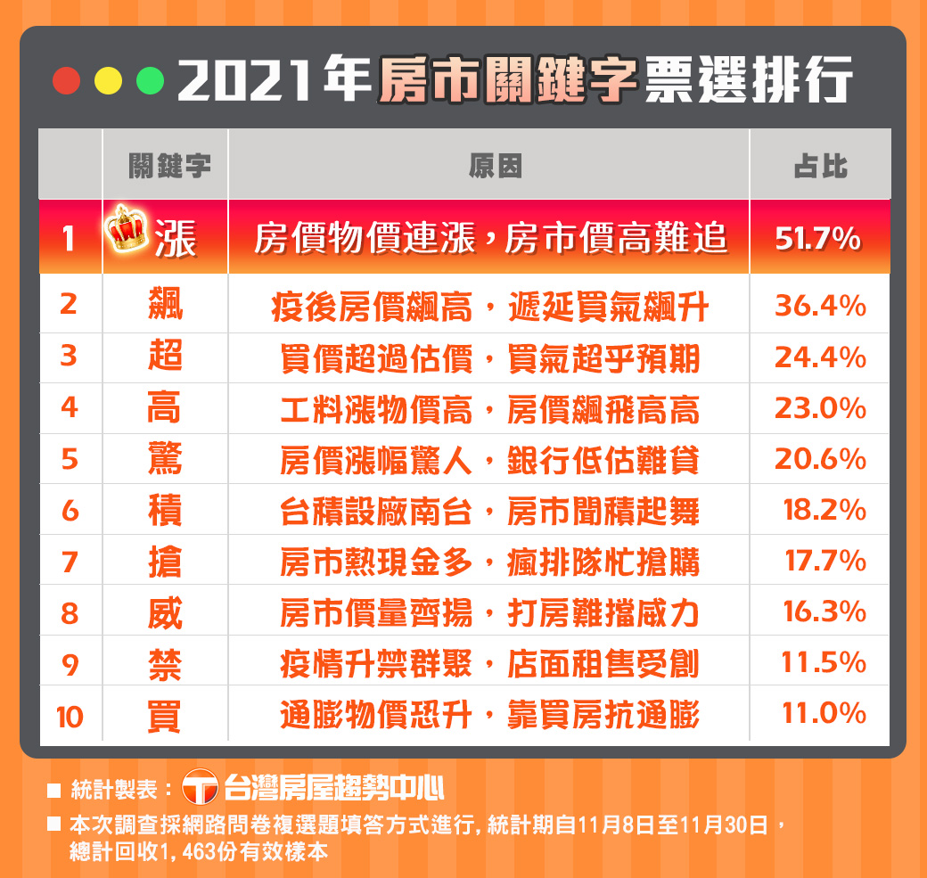 【理財周刊記者顏瓊真報導】台灣房市於2021年雖然經過五月疫情爆發的「三級警戒」震撼,但隨著即將邁入尾聲,由台灣房屋集團趨勢中心舉辦的「2021年房市代表字」網路票選結果出爐,「漲」字獲得逾5成民眾認同,拔得頭籌,獲選原因為「房價物價連漲,房市價高難追」;而「房地合一、實價登錄2.0 新制7/1上路」,則榮登今年度民眾最「有感」的房市新聞,主要是跟荷包有關,更勝南二都最有感的聞「積」起舞。