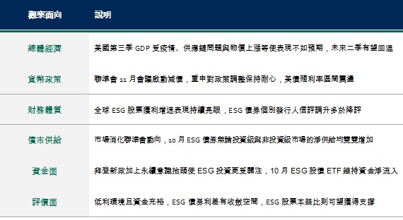 美國聯準會(Fed)11月宣布縮減購債,加上油價續揚增添通膨擔憂,美國10年期公債殖利率震盪,10月份投資級與非投資等級的ESG債券*皆呈現下跌。此外,股市修正後恢復上漲、成長型股如科技股與景氣循環類股如金融、消費等輪番回彈,ESG 股市**整體收漲。