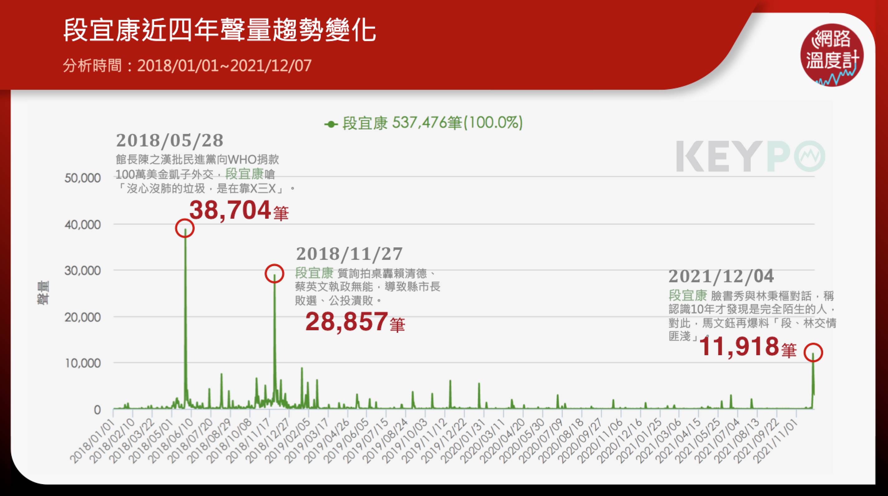 透過《KEYPO大數據關鍵引擎》調查(2018/01/01~2021/12/07)調查統計,段宜康扯峰,網路聲量共有1萬1918筆,主因是段宜康臉書貼文表示他與林秉樞的關係不熟之外,隔天高嘉瑜前男友馬文鈺「入林秉樞事件在12月4日創下高小馬」出面反擊段宜康,並指稱段宜康的「勢力」無所不在,使段宜康聲量衝上一波高峰。