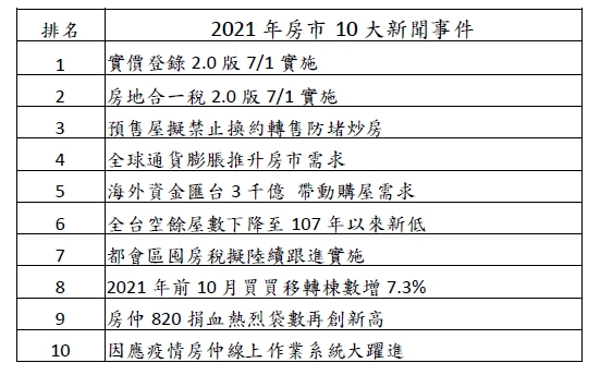 仲介公會全聯會並發表「2021年房市10大新聞」,第一、二名為今年7月1日上路的「實價登錄2.0」及「房地合一稅2.0」(如附表),而政府打算修法,禁止預售屋換約的新聞,則位居第三。