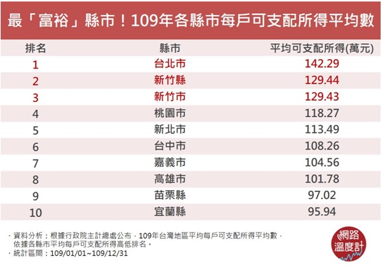 今天<DailyView網路溫度計>將根據行政院主計總處公布的「109年全台各縣市每戶可支配所得平均數」排名,告訴大家全台哪些縣市是最富有,不只說到高薪、高收入的有錢人網友往往第一個提到它,另外也一起來看,除了台北市之外,名列前茅的還有誰?