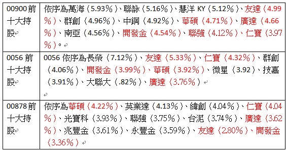 據瞭解,00900最新30檔成分股權重,拿來跟0056及00878的成分股對照,發現有五檔個股都出現在這三大高股息ETF中,例如友達、華碩、廣達、仁寶、開發金。