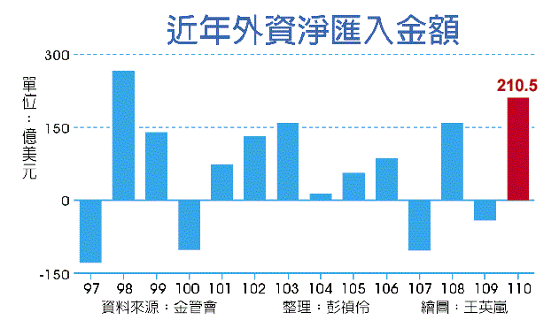 外資愛台股!金管會5日公布,2021年12月外資淨匯入47.51億美元(約新台幣1,312億元),且11及12月連二月淨匯入金額合計達108.49億美元(約新台幣2,996億元),累計2021年全年外資共淨匯入210.5億美元(約新台幣5,814億元),創2009年之後的12年來外資單年最大淨匯入量,也是史上單年第五大金額。