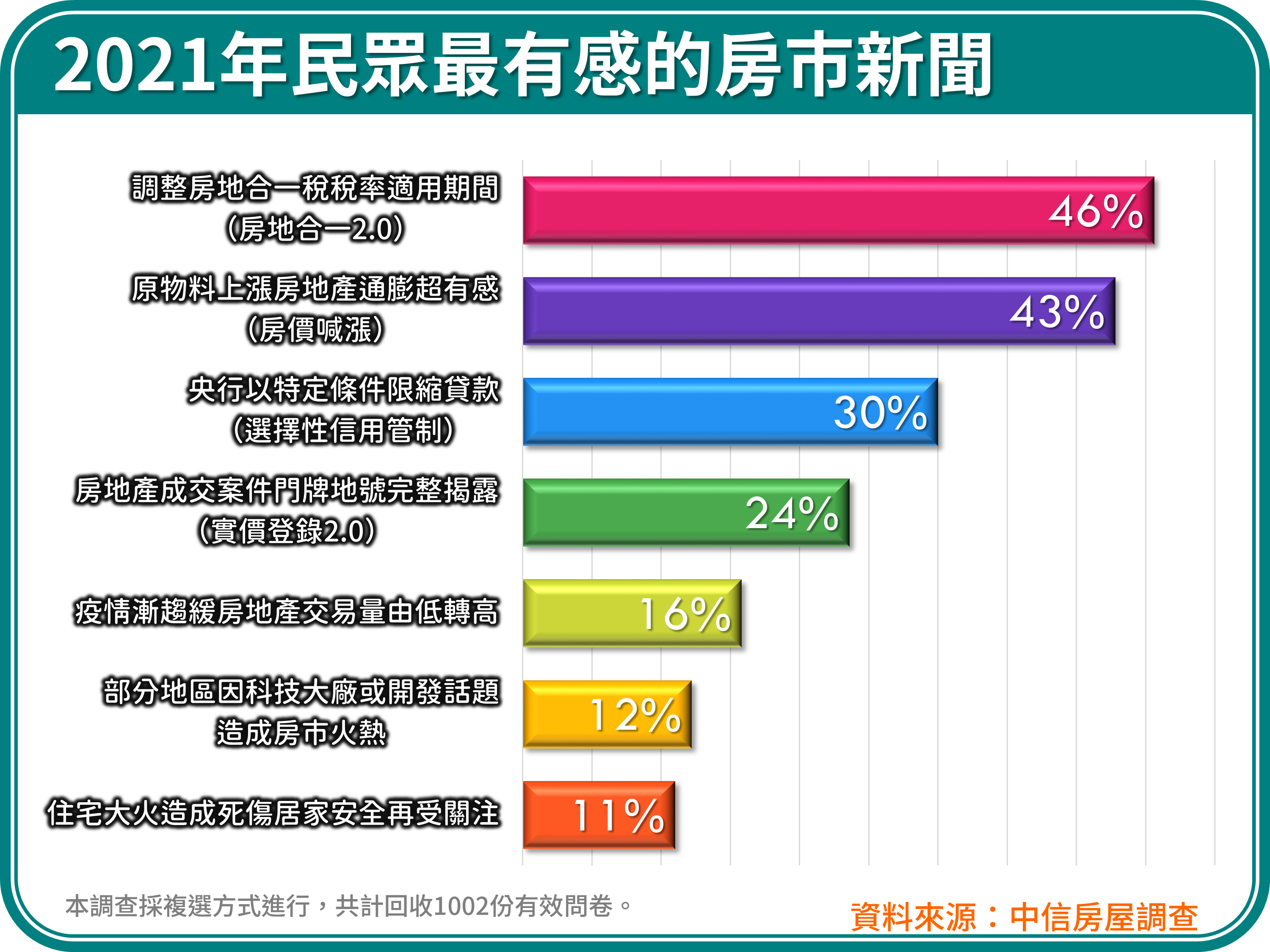由得票數可以發現,民眾對房市要聞在意的重點多集中在與荷包相關的稅制與房價。得票數逾4成以上的熱門新聞共計有得票率46%的「調整房地合一稅稅率適用期間(房地合一2.0)」,以及得票率43%的「原物料上漲房地產通膨超有感(房價喊漲)」兩項,「央行以特定條件限縮貸款(選擇性信用管制)」也獲得30%的票數,其他消息則分別有1到2成不等的票數。