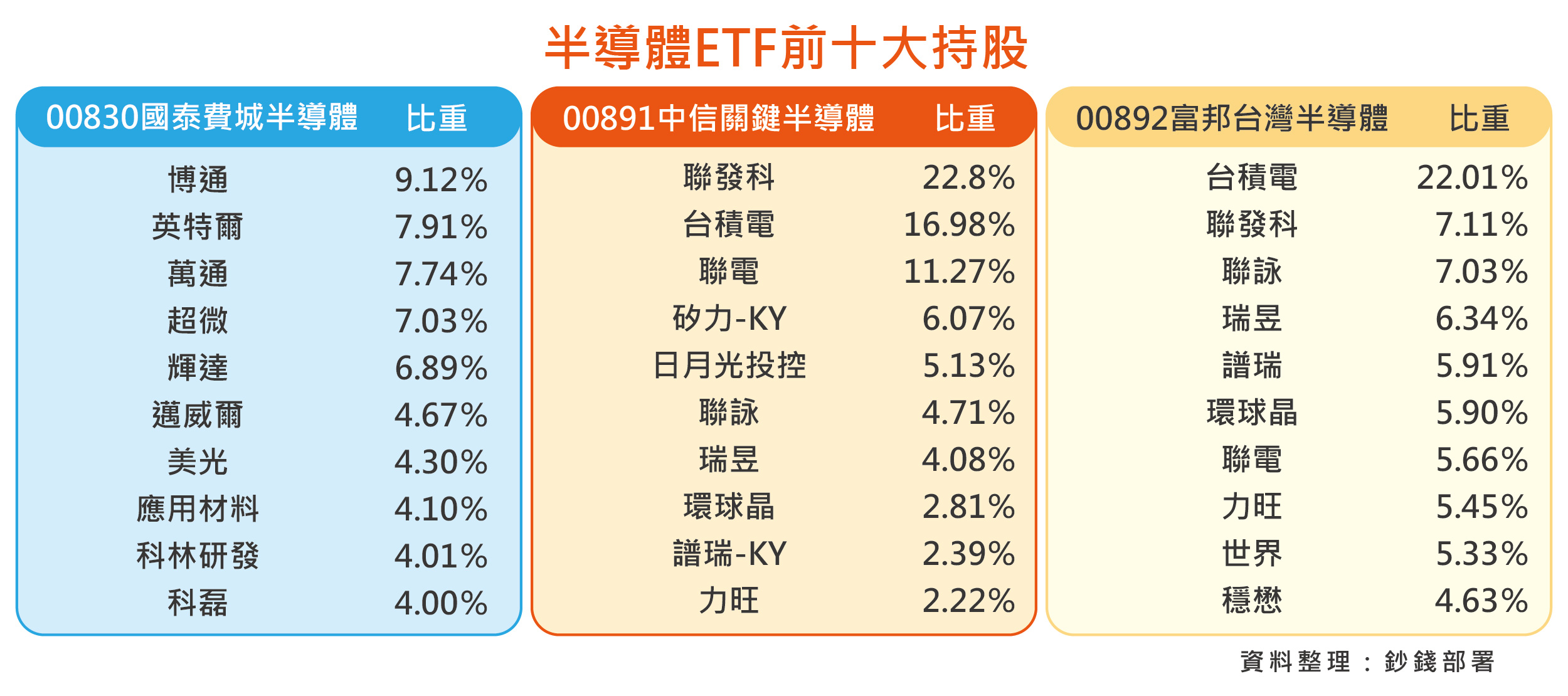李柏鋒提到,國泰費城半導體ETF(00830)主要以美股為主,如果對美國半導體公司有信心,不妨選擇此檔,其實像成份股高通也是跟台灣連動性很強;至於中信關鍵半導體ETF0(00891)跟富邦台灣核心半導體 ETF(00892)價格都是差不多,體質也很像。