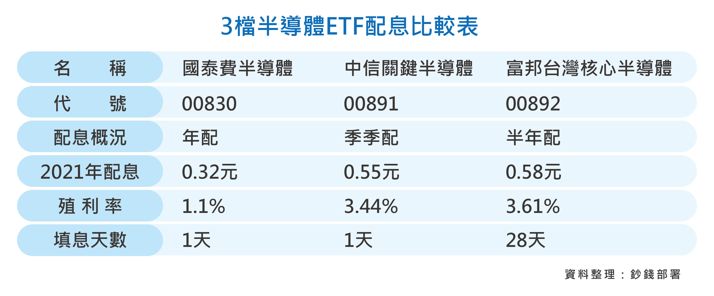 很多人在乎配息,國泰費城半導體ETF(00830)採取年配,2021年配息032元,殖利率1.1%多;中信關鍵半導體ETF0(00891)是執行「季配息」的制度,也就是每3個月會配息一次,預計是每年的一月、四月、七月、十月配息,配息0.55元,殖利率3.44%;富邦台灣核心半導體 ETF(00892)F在配息上只有半年配息一次,在每年的六月、十月決定要不要配息出去,配息0.58元,殖利率3.61%。