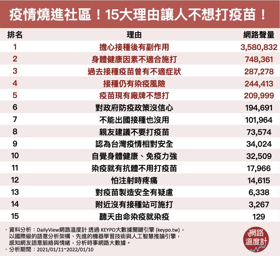 在全球疫情肆虐、人人搶打疫苗的情況下,仍然有部分民眾基於不同理由選擇拒絕接種疫苗,甚至產生「疫苗猶豫」現象,<Daily View網路溫度計>今天就帶你透過<KEYPO大數去關鍵引擎>,一起來揭曉他們不想施打疫苗的15大幕後原因。