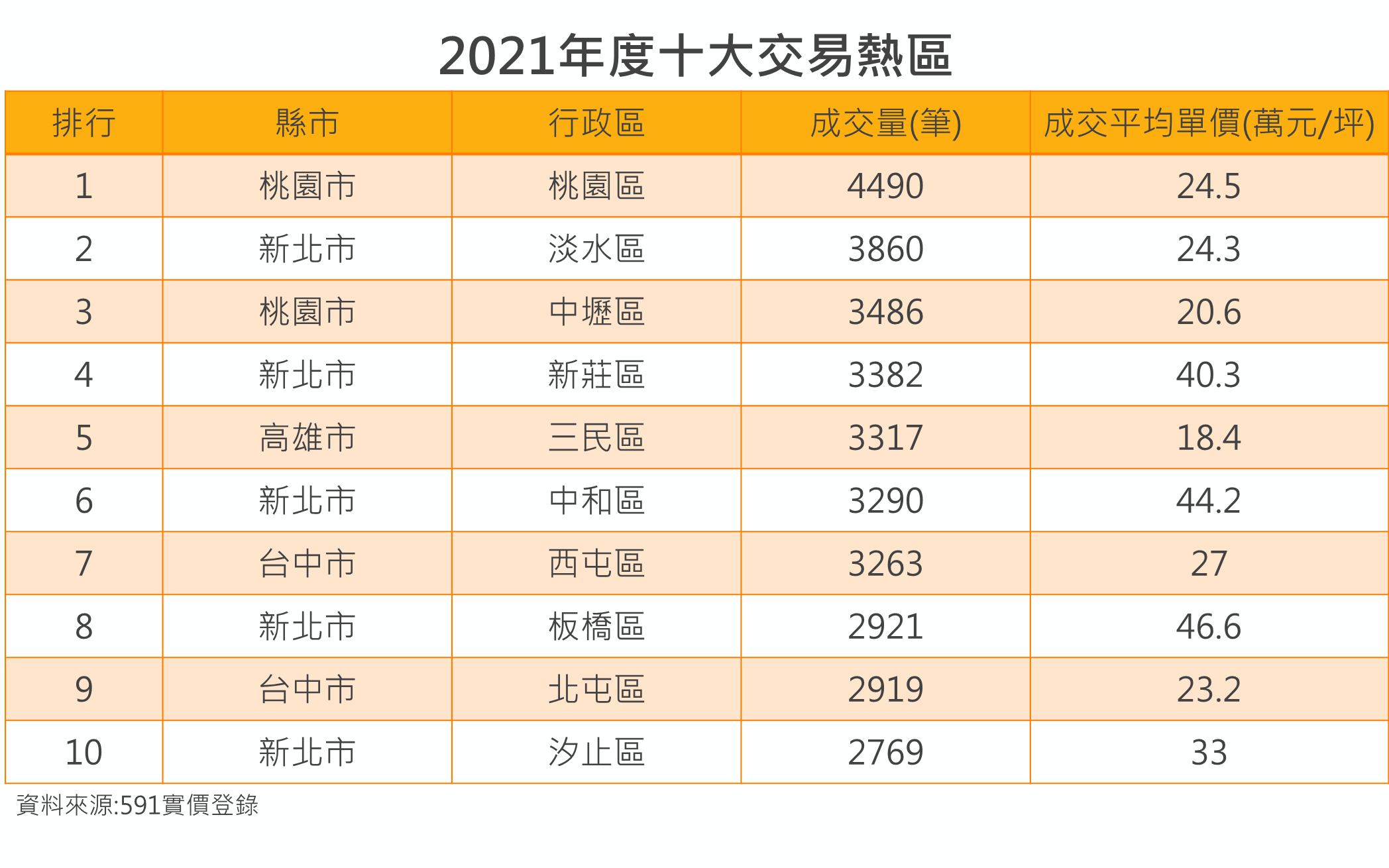 【理財周刊記者顏瓊真報導】房市有多熱?根據「591實價登錄」資料,2021年全台十大交易熱區當中,前三名分別是桃園、淡水及中壢區,光前三區總計就有超過萬件的交易量,可見熱度,而「林三淡」以前老被笑「鬼城」,但今非昔比,淡水區成交居冠軍,終於可揚眉吐氣了。
