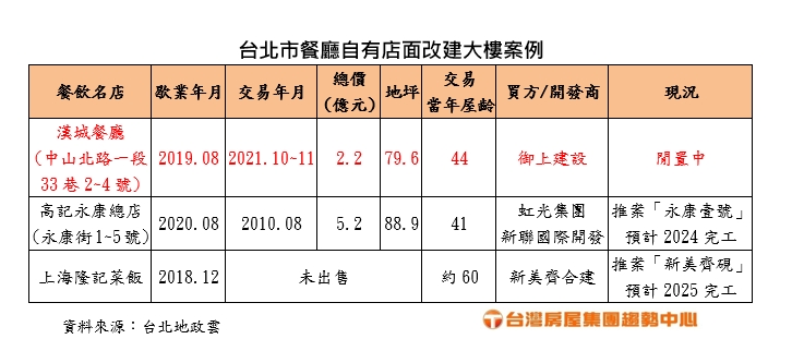 台灣房屋也觀察指出,近年餐飲老店歇業後,經營人將自有店面轉推案的案例也不少,包括位於中山堂附近的65年老店「上海隆記菜館」,於2018年因人手不足歇業後,就以地主身分和新美齊一起改建,推出「新美齊硯」小宅新案,預計2025年完工。