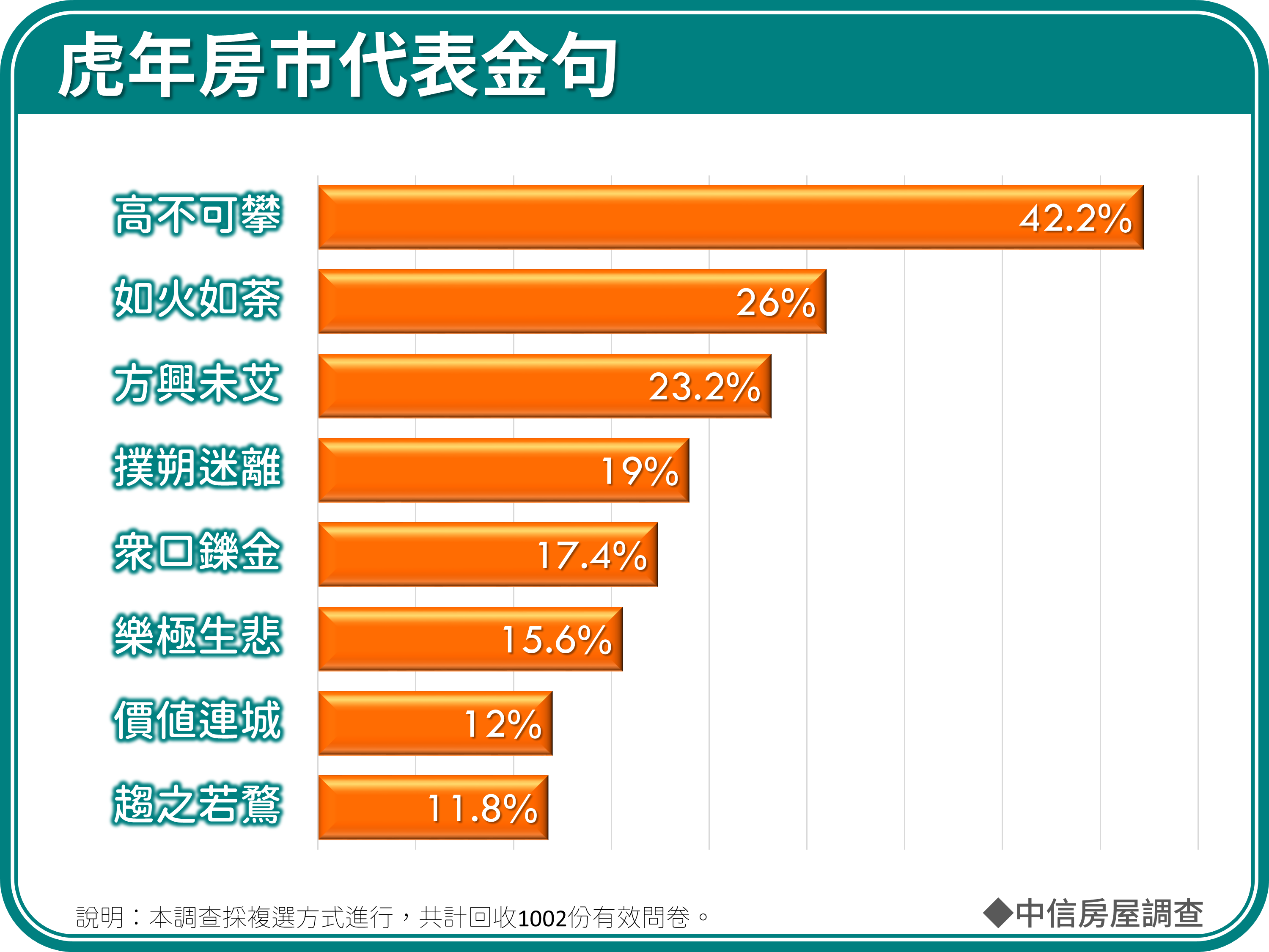 其他像是形容難以看清事物真相的「撲朔迷離」、眾口同聲營造混淆是非的「眾口鑠金」,以及歡樂到了極致將會轉為悲哀的「樂極生悲」,這類對房市抱持較為負面的金句,得票率則都不到2成,可見多數民眾認為,虎年房地產將有持續成長的可能,趨勢反轉的可能不大。
