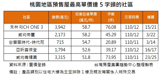 台灣房屋集團趨勢中心指出,根據實價登錄顯示,2021年桃園市預售市場最高單價在4字頭以上的預售案,就多達近40個,之中有五個建案的最高單價更衝破5字頭,其中「禾林RICH ONE 3」,以58.7萬元,創下桃園預售屋交易冠軍。