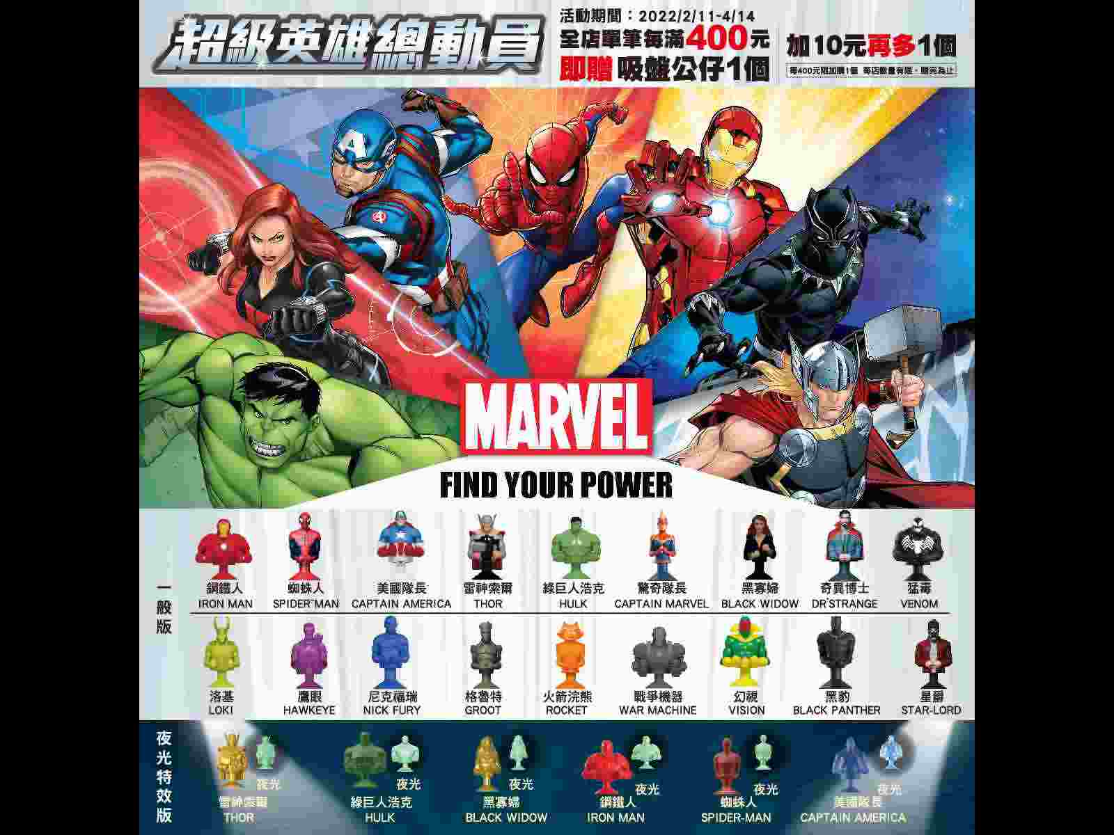 全聯今年首度取得漫威肖像授權,只要在2月11日起至4月14日期間到全聯消費滿額,就可獲得一個漫威英雄吸盤公仔,收集到全套24款公仔,還有機會抽到1:1鋼鐵人金屬色特別版雕像。