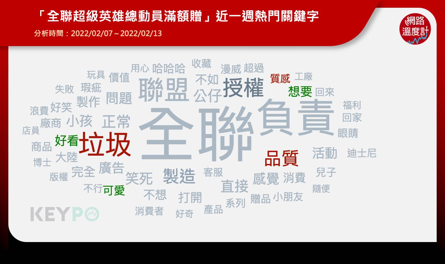 根據《KEYPO大數據關鍵引擎》熱門關鍵字來看,許多網友認為「質感」很差、「品質」不一,痛批拿「垃圾」當贈品、拿了直接丟進「垃圾」桶,且有網友認為吸盤玩偶門檻高又醜,好玩、好看都沒有,網友直言「不如不要送」。