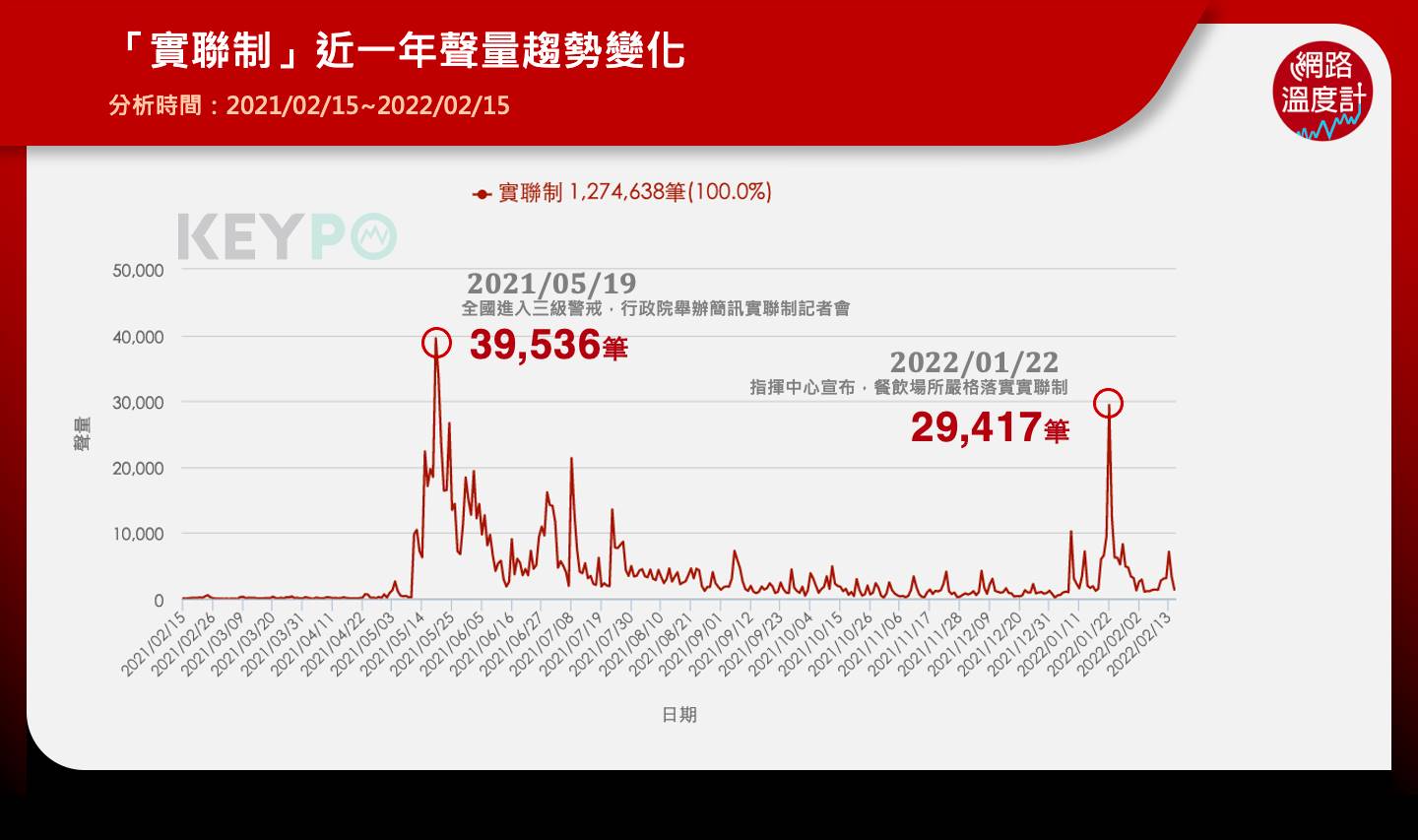 根據《KEYPO大數據關鍵引擎》調查,實聯制的討論聲量超過120萬筆,其中最高峰落在2021年5月19日全國進入三級警戒,行政院舉辦簡訊實聯制記者會,政府、民間單位呼籲民眾落實,引起近4萬筆的聲量,次高峰則是1月22日,桃園西提案延燒至社區,中央流行疫情指揮中心宣布餐飲場所須嚴格落實實聯制,更表示,若不確實餐廳就會停止內用,引起近3萬筆討論。