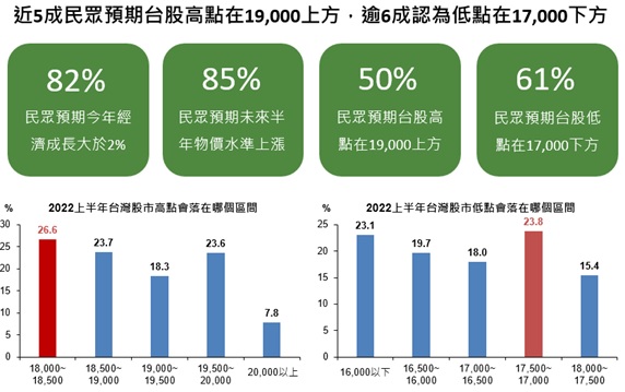 針對民眾對2022上半年台股加權指數高點會落在哪個區間的預期,本次調查結果顯示:高達26.6%的民眾認為台股指數高點將落在18,000~18,500區間,23.7%的民眾預期高點落在18,500~19,000區間,23.6%則認為落在19,500~20,000區間,僅7.8%的民眾預期高點會超過20,000,總結而言,近5成的民眾預期2022上半年台股高點在19,000上方。