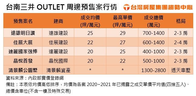 台灣房屋趨勢中心經理李家妮指出,觀察台南三井Outlet所在的高鐵特區,目前尚處長房期,特區內僅有的四場建案,均為預售案,根據內政部實價揭露,包括遠雄建設推出的「遠雄明日讚」、達麗建設的「達麗國家強棒」,還有「佳展大展」及「晶悅首發」,2021年平均預售成交單價均已站穩2字頭,每坪最高成交價更衝上29萬元,離3字頭路不遠矣。