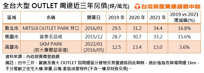 根據台灣房屋集團統計,全台大型Outlet的周邊房市行情,除台中三井、麗寶及高雄義大因地處郊區,周邊住宅交易量不多之外,其他包括林口三井Outlet、桃園華泰名品城,以及1月才從大魯閣草衙道改裝的高雄SKM PARK,近三年房價均呈現上漲表現,平均漲幅從3.6%~16.8%不等,住家附近有Outlet,似乎成為助漲房市發展的推手之一,也讓人對台南三井Outlet周邊未來房價走勢充滿想像。