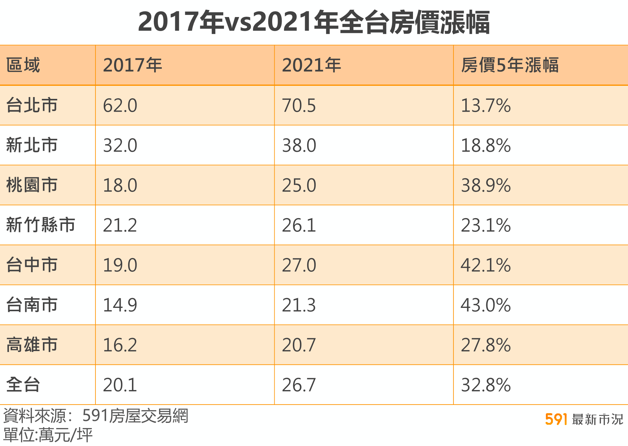 「591實價登錄」指出,近日社群媒體上流行PO出5年前的自己,不少人都感嘆回不去!但,回不去的其實還有房價。根據統計,5年前(2017年)全台房屋單價約20.1萬元,而2021年房屋單價已上漲到26.7萬元,增幅達32.8%。