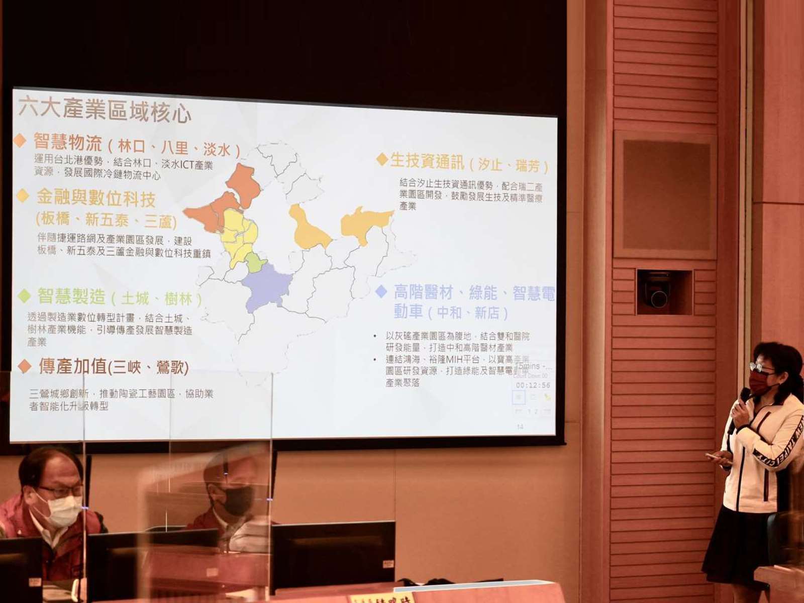 在「創造產業空間」上,市府在六大區域基礎下發展聚落空間,如八里運用台北港優勢,結合林口、淡水的ICT發展智慧物流中心、在中和與新店推動高階醫材、綠能及智慧電動車、汐止與瑞芳發展生技資通訊產業,另建立板橋、新五泰及三蘆金融與數位科技重鎮、土樹傳產導入智慧製造、三鶯地區則以陶瓷工藝AI智能化轉型。