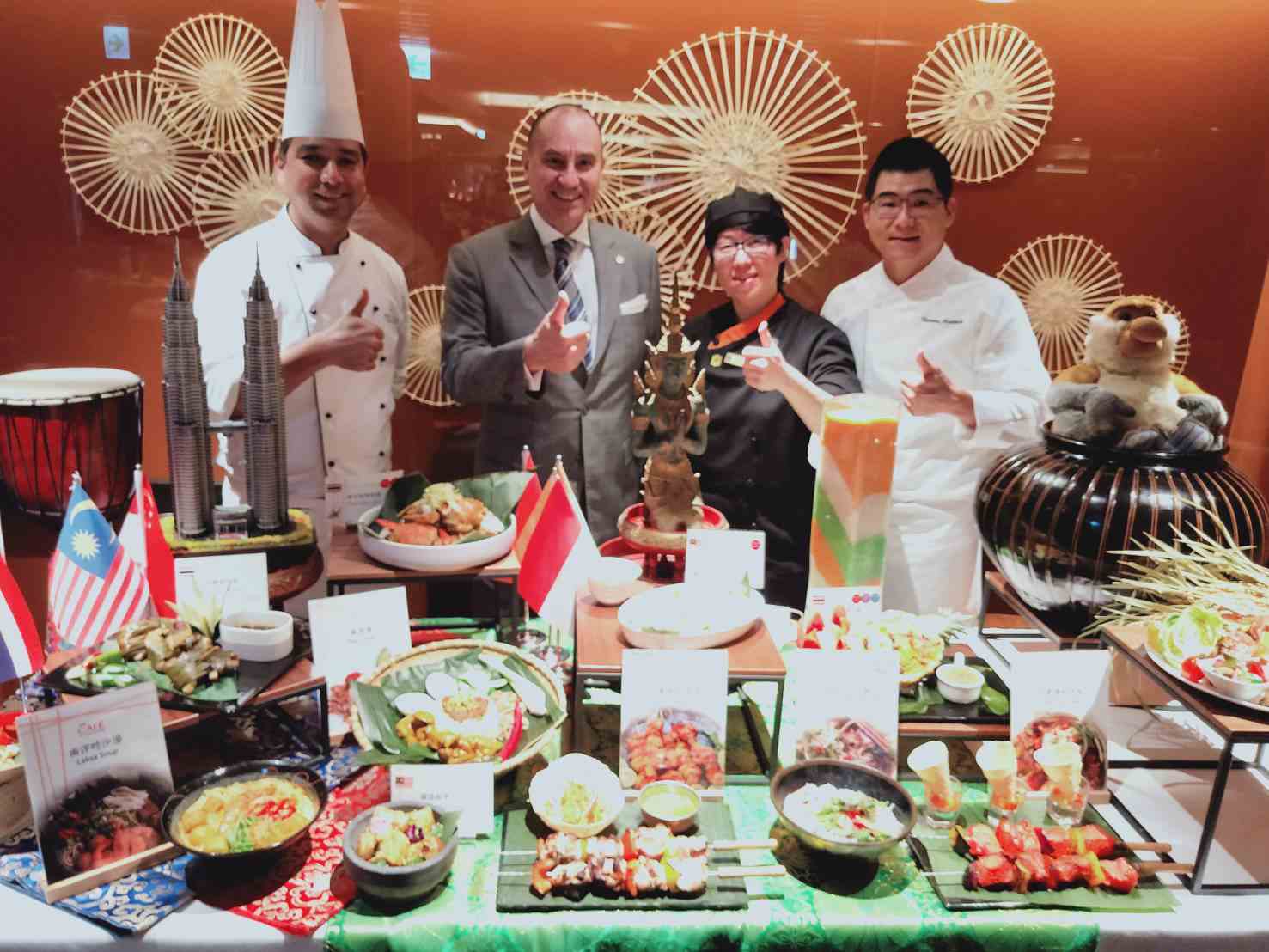 圖說:台北遠東香格里拉大飯店推出東南亞美食展,印度籍主廚羅瓦特(Shiv Rawat)(左起)、區域總經理萬佐東 (Marco Vazzoler)、馬來西亞籍主廚黃愛珍(Jayne Ooi)及飯店泰籍行政主廚陳帝昕(Thitisorn Amatasin)共同合影。
