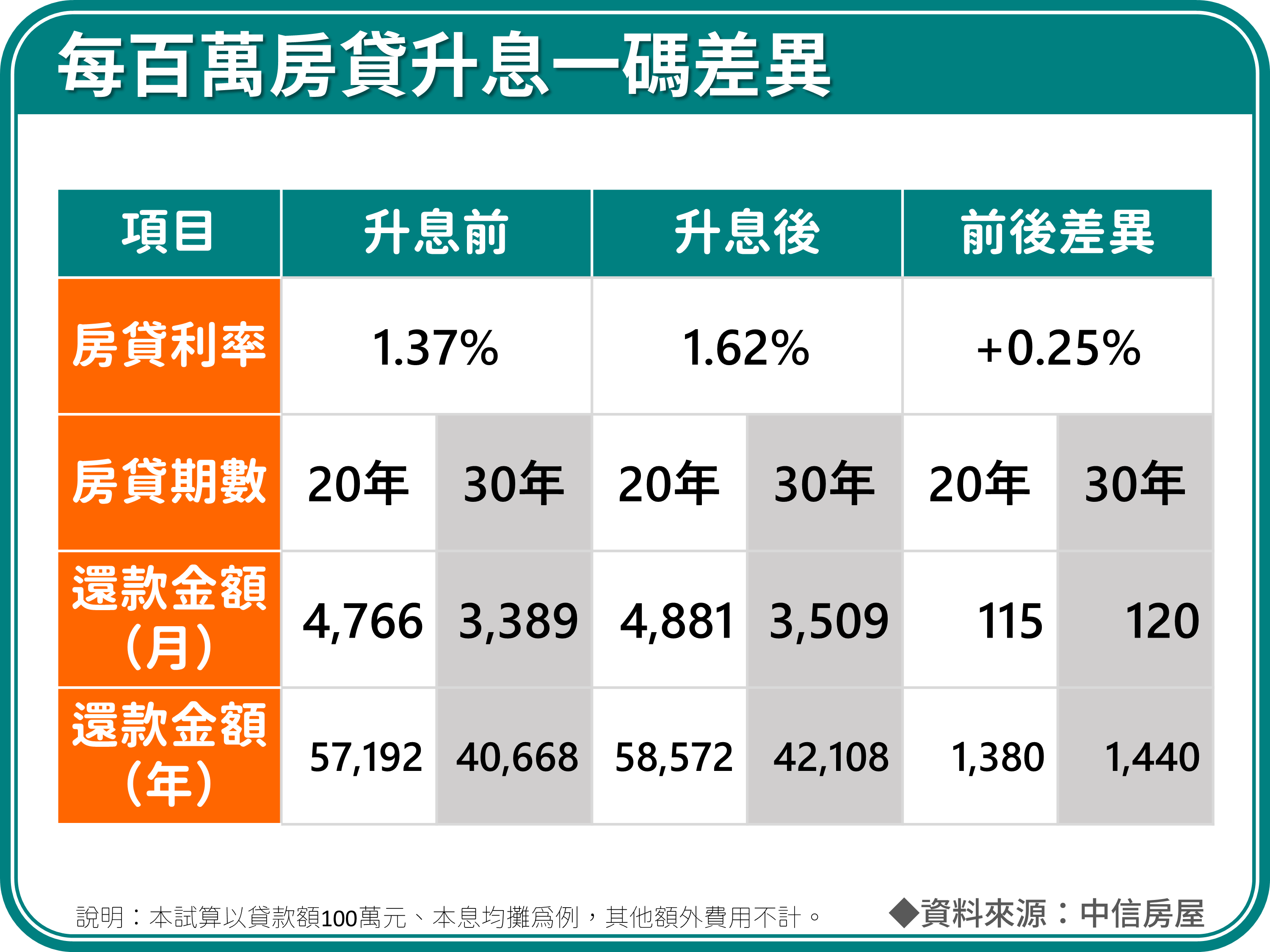 至於本次升息1碼,會對買方房貸族帶來多少影響?以房貸利率由1.37%調高至1.62%來計算,20年期房貸每貸款100萬元,每月僅增加約115元,每年總計增加約1,380元。若是千萬房貸,每年增加也僅13,800元,即使房貸要揹30年期,每年也只有增加14,400,其實影響尚在可接受的範圍內。