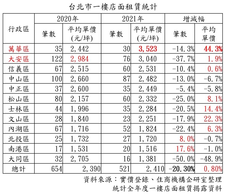 大家房屋企畫研究室副理郎美囡表示,台北市去年(2021)全年一樓店面租賃共521筆,跟前年(2020)相比大減20.3%,減少最多的行政區為大同區,年減50.0%,而12個行政區中僅北投區及南港區店面租賃筆數增加。