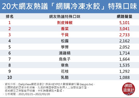現在各家網購水餃還研發出各種特殊口味,讓人忍不住想嚐鮮,馬上就和《DailyView網路溫度計》一起,透過《KEYPO大數據關鍵引擎》分析,網友熱議的口味中,哪些最特別也最受歡迎呢?