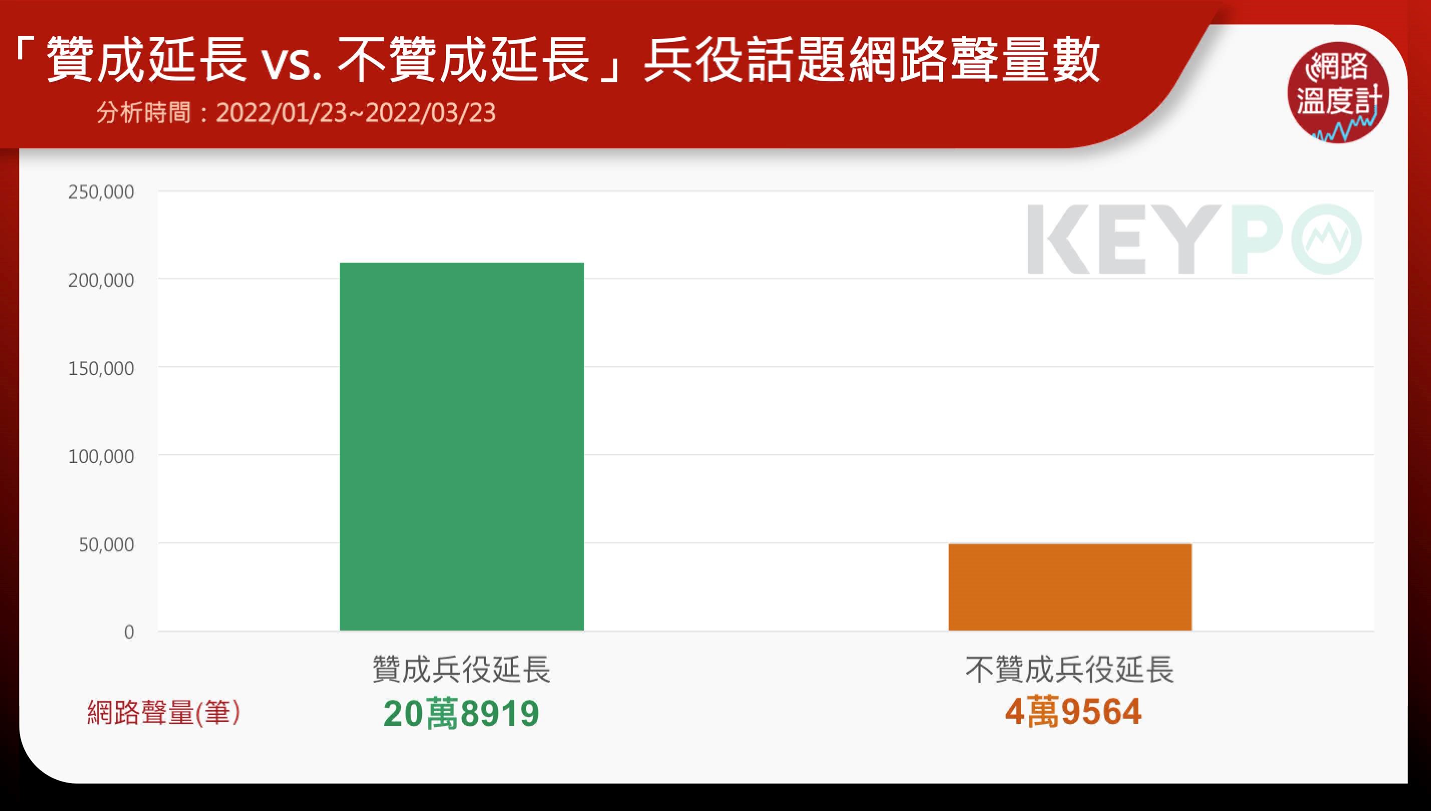 針對「贊成延長和不贊成延長」兵役話題網路聲量趨勢,透過《KEYPO大數據關鍵引擎》調查(時間:2022/01/22~2022/03/23),以近兩個月「贊成兵役延長」來看,2022年03月13日當天網路討論聲量來到近期最高峰,高達20,835筆,主要在於當日傳出總統蔡英文要求國防部,檢討現行四個月軍事訓練役的役期是否延長,對此消息,雖然府方予以否認,同時也帶動網路熱議。但事情並未畫上句點,3月23日國防部長邱國正對外證實「兵役延長,研擬不修法」,總統府也再度做出回應「評估義務役役期長度的同時,必須加大訓練量能,更重要的是訓練內容必須進行改革」,再度拉抬兵役話題聲量,當日討論聲量達14,990筆,顯示討論熱度依舊。以目前情勢來看,在烏俄戰爭的影響,加上台灣多年兵力、兵源問題尚未解決,即使議題已經延燒多日,但熱度、討論度似乎還會繼續下去。