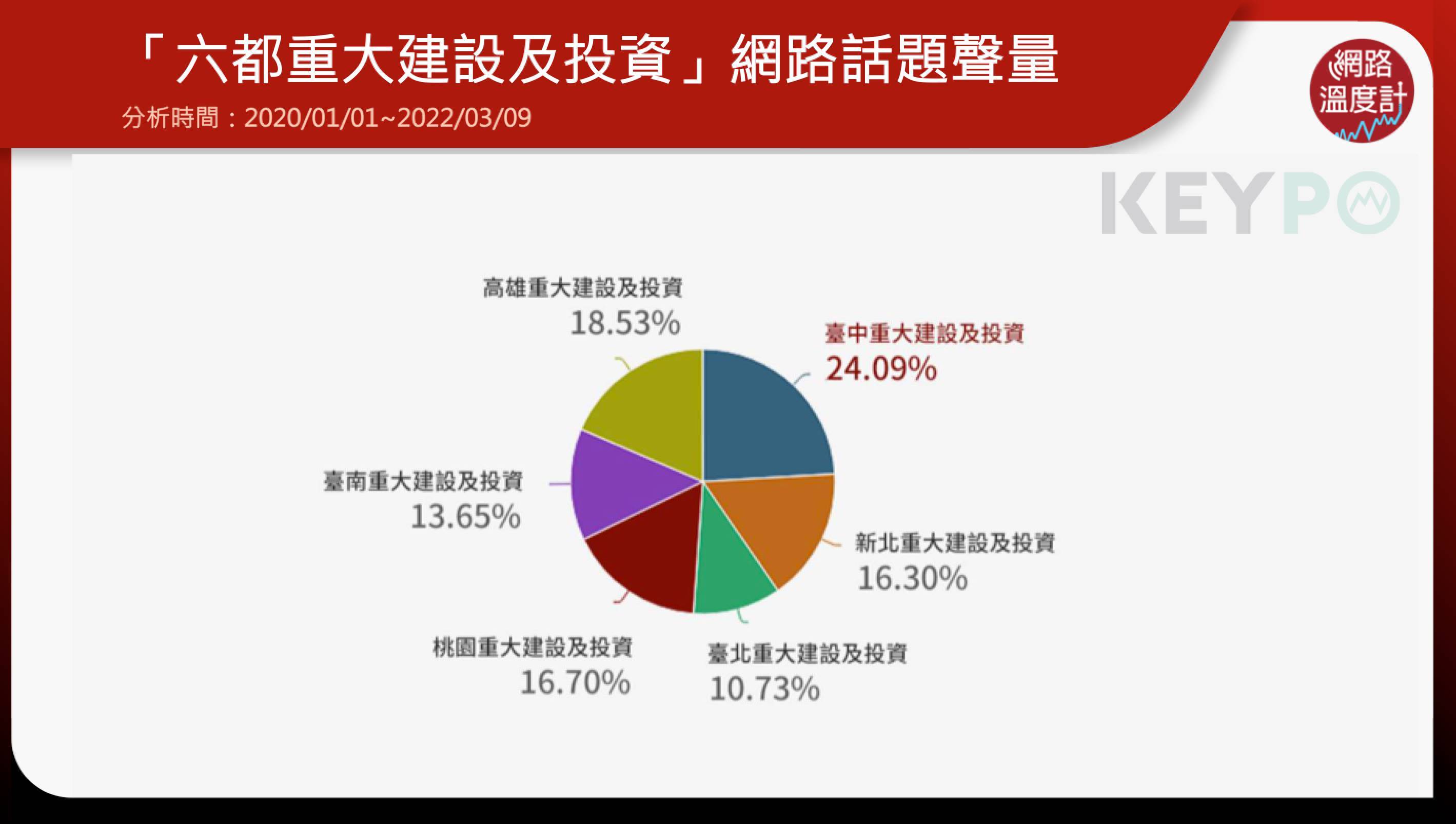 後疫情時代來臨,全球籠罩在停滯性通膨與經濟衰退的風險中,許多國家透過加緊重大建設的腳步,降低經濟成長放緩帶來的影響,臺灣也不例外。其中,六都之中的臺中市表現尤其亮眼,不僅有捷運綠線帶動軌道經濟,各項重大建設也已經拍板動工,預期在3至5年間就可以陸續啟用。透過《KEYPO大數據關鍵引擎》調查(2020/01/01~2022/03/09),臺中市在這一波「六都重大建設及投資網路話題聲量趨勢」的網路話題中,網路聲量共計1,639筆,成為最吸睛的網路話題聲量王。