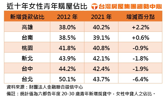 另外,進一步分析20-30歲青年購屋客群中,女性青年購屋佔比,主攻高雄、台南,各增加2.2及0.6個百分點。台灣房屋集團趨勢中心經理李家妮表示,南二都的女力近年成長明顯,女權抬頭,女性主管越來越多,收入條件提升,也提高女性購買力,加上現今不婚不生女性增加,買個小宅養個毛孩,甚至置產投資,形成新興女力市場。