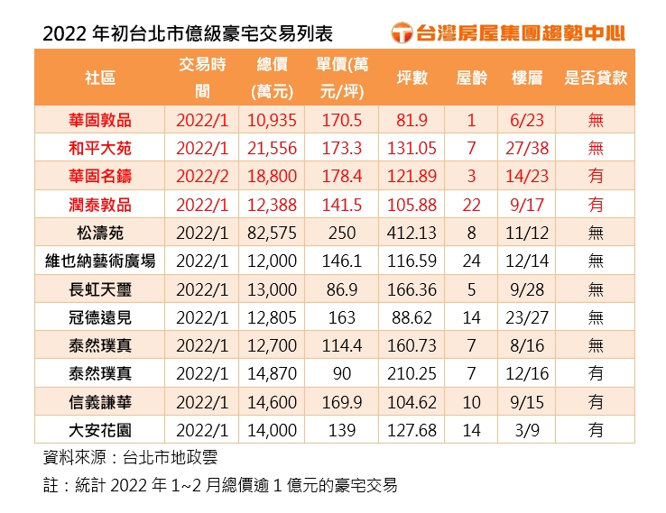 【理財周刊記者顏瓊真報導】台灣房屋集團統計今(2022)年台北市實價登錄逾億元的豪宅交易,截至目前為止,共有12筆億元豪宅交易,總金額約24億元,當中就有7筆是無貸款買進,佔整體近6成左右,並可見不少富豪加碼掃樓。