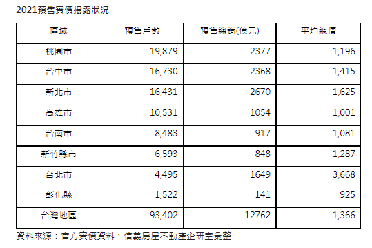 信義房屋統計去年實價揭露資料顯示,市場規模最大的新北市,一年預售揭露約1.64萬件,不過桃園市與台中市都超過新北市,桃園市一年揭露1.99萬件,台中市也揭露1.68萬件,雙雙超過人口與市場規模最大的新北市,顯見區域推案銷售熱絡,以持續攀升的房價來看,裡面也可能存有部分非自用的需求。