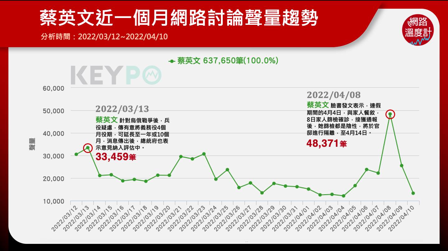 總統蔡英文清明連假與家人官邸聚餐後,8號家人因為身體不舒服,去醫院篩檢後,確診為陽性,蔡英文也從8號起在官邸居家隔離,時至14日,根據當天下午以及10日進行篩檢結果,蔡英文皆為陰性,健康狀況也都維持良好,不過隨著疫情一路延燒,總統和總統府也受到影響,就在蔡總統居家隔離消息傳出之後,網路上輿論炸鍋,不少網友針對「蔡英文的居家隔離、元首的健康狀況」,熱議討論。