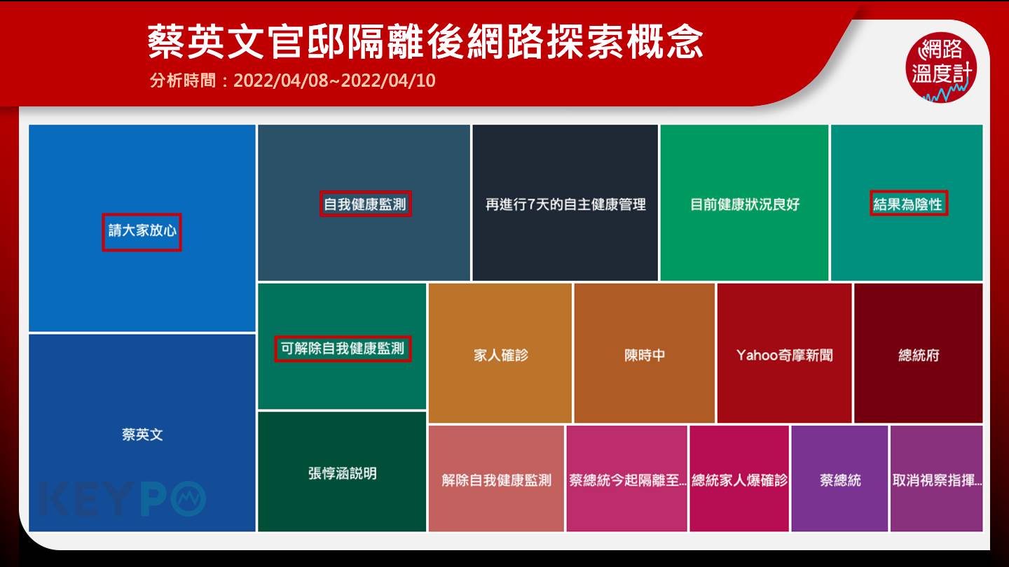也是因為總統蔡英文居隔期間,仍然在臉書持續發文,所以根據《KEYPO大數據關鍵引擎》(時間:2022/04/08~2022/04/10),總統蔡英文在官邸隔離後,網友探索概念也可以發現,「請大家放心」、「目前健康狀況良好」、「結果為陰性」等討論度也相當多,另一個包括因為總統在清明連假後與行政院長蘇貞昌、衛福部長陳時中等人,在官邸開了防疫會議,第一時間蘇貞昌、陳時中表示將「自我健康監測」至16日,到了當天晚上指揮中心發言人莊人祥宣布,因為全程配戴口罩,並保持適當社交距離,風險相對低,「可解除自我健康監測」,也引起網友討論。