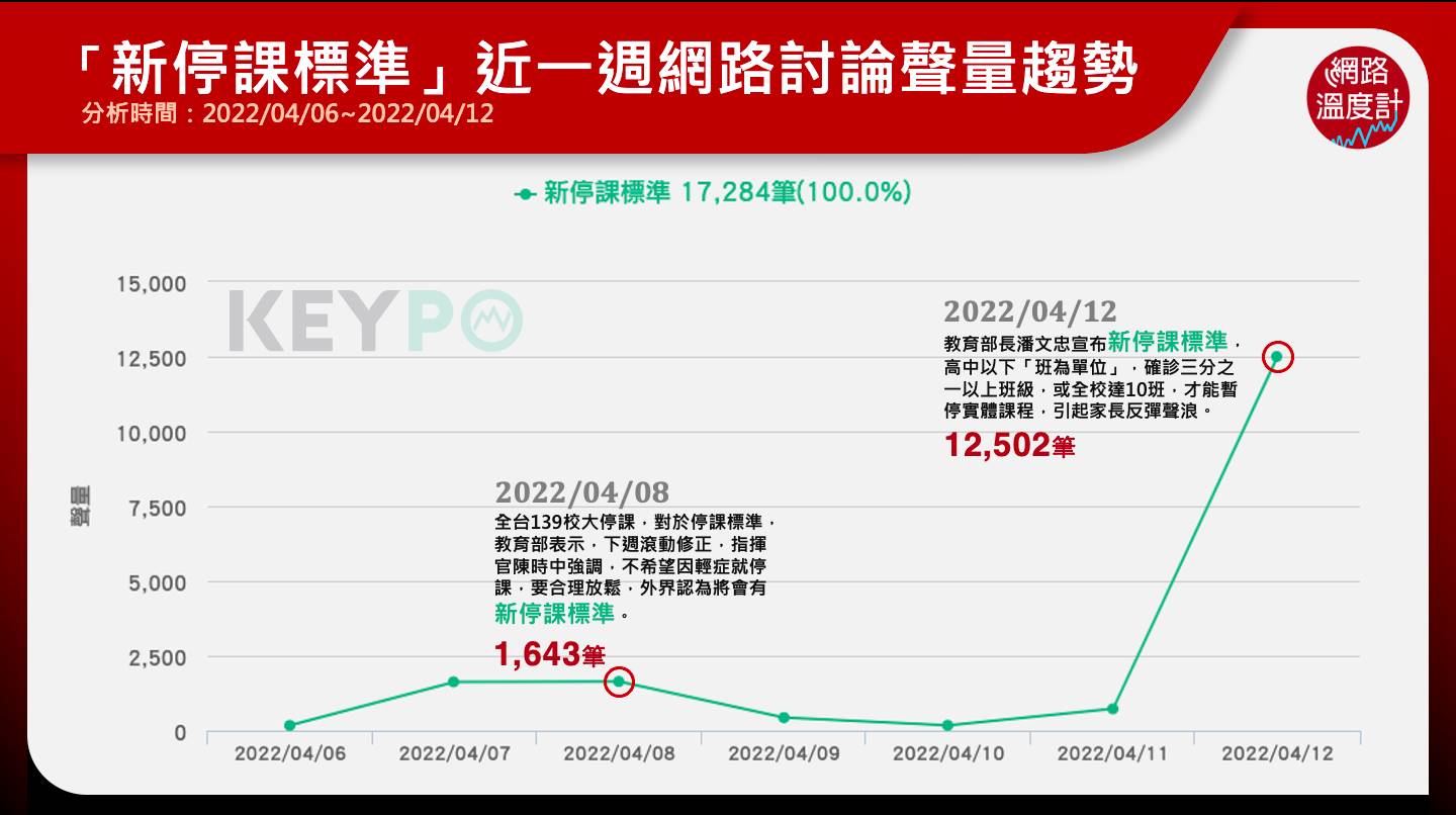 透過《KEYPO大數據關鍵引擎》(時間:2022/04/06~2022/04/12)統計調查,「新停課標準」光是4月12日公布後當天,網路討論聲量立刻飆到1萬2,502筆,隨著教育部臉書公布詳細政策,家長隨之灌爆教育部臉書,批評「都1/3是在停心酸的嗎?國小以下根本沒打疫苗,卻做這種決策真的讓人傻眼」、「父母們的擔憂害怕都沒看到嗎」、「沒選票才被犠牲」。另外,也有部分網友支持放寬,不過還是希望有配套,不只在網路延燒,雲林縣長張麗善也以「風險太大」開出第一槍,考量12歲以下國小及幼兒園未打疫苗,決定不跟進,12歳以上則遵照教育部最新公告,新竹縣13日也宣布跟進雲林縣措施,教育部長潘文忠表示未來會組應變小組,個別地方或學校若有特殊考量,可透過應變小組討論,並強調防疫規範標準,會秉持與過去一樣的方式,能夠在指引下了解個別需求,如果有必要會再做一些滾動修正。