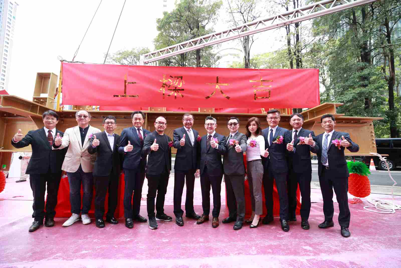 忠泰集團副董事長洪調進(左6)表示,「忠泰老佛爺」深受各界開注,但一開工就遇上工料雙漲,所幸合作夥伴全力配合,才能讓工程進度順利。