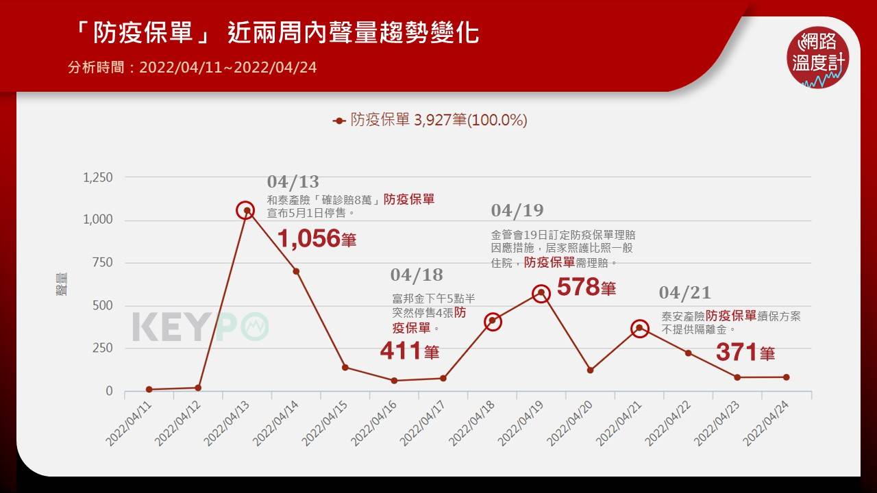 根據《KEYPO大數據關鍵引擎》(2022/04/11~2022/04/24)統計調查,和泰產險4月13日悄下架「隔離賠4萬」防疫保單;另宣布5月1日將下架「確診賠8萬」的防疫保單,消息一出,單日討論筆數達1056筆。防疫險投保方式分為網路投保和業務員通路,和泰產險先前推出一張網路投保防疫險「新疫點零補償型B方案」,年保費定為614元,確診補償金為每次5萬元、隔離補償金為每次4萬元,為業界隔離補償最高的方案,在網路上有高討論度。而在業務員通路方面,和泰產防疫險保費1499元,確診賠8萬,隔離賠3萬,日額3000元,疫苗住院日額2000元,雖然保費較其他公司的高,但因理賠金額還有保障內容相當吸引人,下架消息一出,引起熱烈討論。