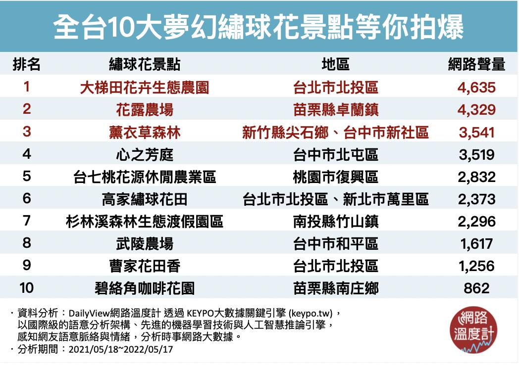 今天就讓《DailyView網路溫度計》透過《KEYPO大數據關鍵引擎》一起來看全台10大繡球花熱門景點,大家在賞花的同時也不要忘記戴口罩、勤洗手及保持社交距離。
