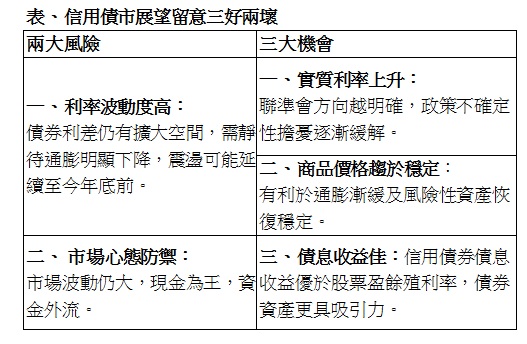 周曉蘭也認為,觀察近期非投資等級債資金外流狀況已較緩和,顯示收益率上升開始引起投資人青睞,長期來看,具備三大機會,包括(1)實質利率上升,聯準會方向越明確,政策不確定性擔憂逐漸緩解;(2)商品價格趨於穩定,有利於通膨漸緩及風險性資產恢復;(3)信用債券債息優於股票盈餘殖利率,債券資產更具吸引力。