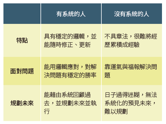 有系統的人,分析問題、解決問題都會有比較穩定的邏輯,碰到問題,也可以用自己的基本邏輯應對,所以有穩定的勝率解決問題。